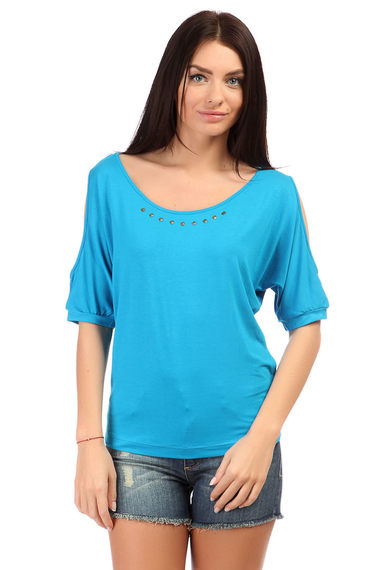 Летняя кофточка из вискозы голубого цвета. Модель имеет рукава 2/4 с прорезями, а так же украшение золотистого цвета по горловине.